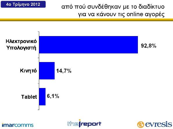 Το i report κατέγραψε συνεχιζόμενη αύξηση στη χρήση του κινητού τηλεφώνου για online αγορές φτάνοντας το 14.7% των συνολικών online αγορών του τέταρτου τριμήνου του 2012, ενώ επίσης συνεχιζόμενη αύξηση κατέγραψαν οι αγορές που έγιναν μέσο Tablet φτάνοντας το 6.1%. Το ποσοστό των αγορών που έγινε μέσο ηλεκτρονικού υπολογιστή έφτασε το 92.8% επιστρέφοντας σε υψηλά επίπεδα από την πτώση του προηγούμενου τριμήνου.